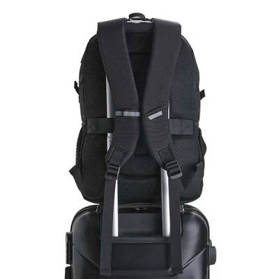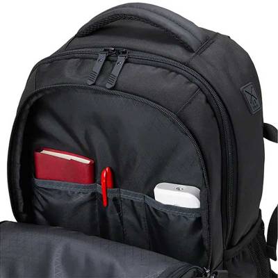 Mochilas Mochila preta em Polyester / PU. Conta com alças para as costas com faixa refletiva e bolso, alça para as mãos, alça para pendurar e alça carona para mala. Na parte externa conta com saída para fio, faixa refletiva, borrachão, dois fechos laterais, dois bolsos laterais com tela, bolso frontal e dois bolsos na parte superior com fechamento em zíper. Na parte interna do primeiro bolso, conta com 4 compartimentos. No bolso principal, conta com compartimento aveludado para notebook e mais um compartimento. 32,0 cm x 43,0 cm x 16,5 cm 475 g