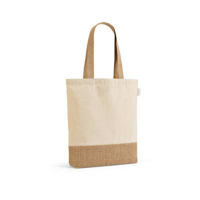 Sacola em 70% algodão reciclado e 30% poliéster reciclado (180 g/m²) com base em juta. Alças em webbing com 65 cm.