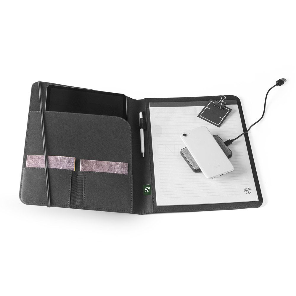 Pastas Pasta A4 em poliéster 100% reciclado 300D, com elástico para fecho. O interior contém vários bolsos, suporte para esferográfica (não inclusa) e um caderno com 40 páginas pautadas, em papel proveniente de gestão florestal sustentável. 23,0 cm x 33,0 cm x 5,0 cm 499 g