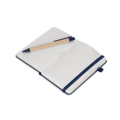 Bloco para Anotações Caderneta ecológica de capa dura revestida em fibra de palha de trigo. Contém aproximadamente 80 folhas brancas com pauta, além de duas folhas de guarda, uma fita para fechamento e porta-canetas elástico. Acompanha uma caneta esferográfica de carga azul de 1,0mm com corpo em papelão e clip, acionamento por clique e ponteira em plástico. 9,3 cm x 14,0 cm x 1,3 cm 107 g
