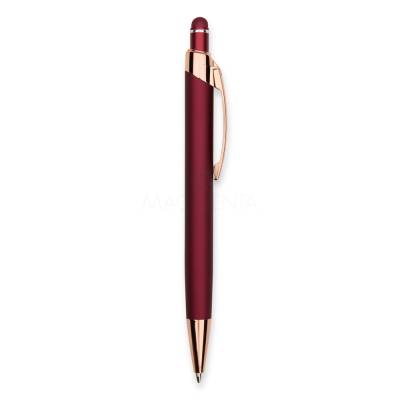 Caneta metálica com carga esferográfica azul de 1,0mm e acionamento por clique de revestimento emborrachado para interação em dispositivos com telas sensíveis ao toque.