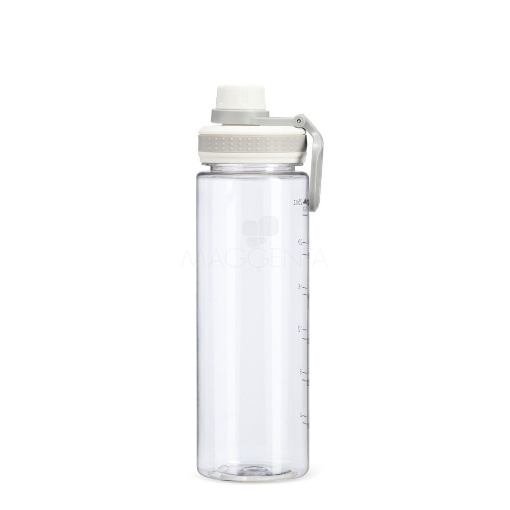 Garrafa plástica com capacidade máxima de 750ml e marcação impressa de volume de até 700ml. Possui tampa rosqueável com protetor para o bocal e alça para transporte.