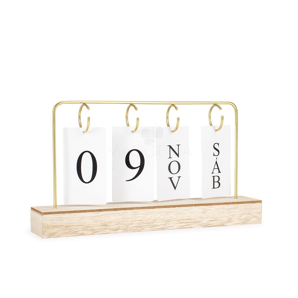 Calendário permanente de mesa com base feita em MDF e moldura de ferro. Conta com fichas em papel cartão que permitem montar a data, trazendo o dia em números e o mês e os dias da semana em versões abreviadas.