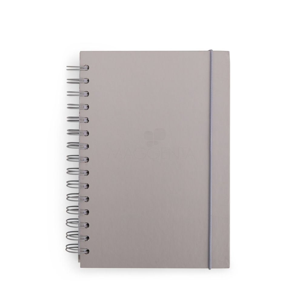 Caderno com capa dura em couchê, encadernação wire-o, marcador de páginas em fita de cetim e elástico para fechamento. Conta com aproximadamente 160 folhas brancas com pauta.
