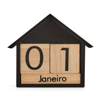 Calendário de mesa permanente em madeira com formato de uma casa. De uso intuitivo, conta com dois cubos para os dias do mês em formato numérico e três blocos com os nomes dos meses para atualização manual de data.