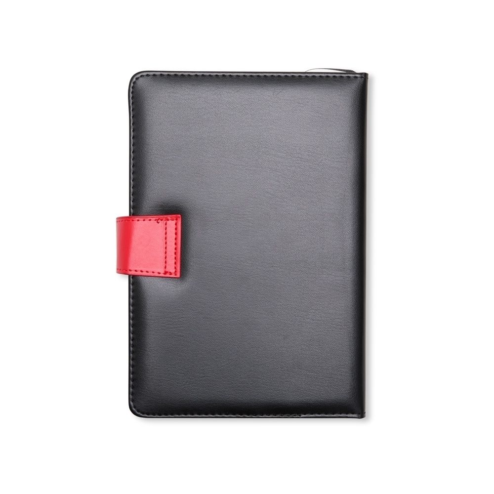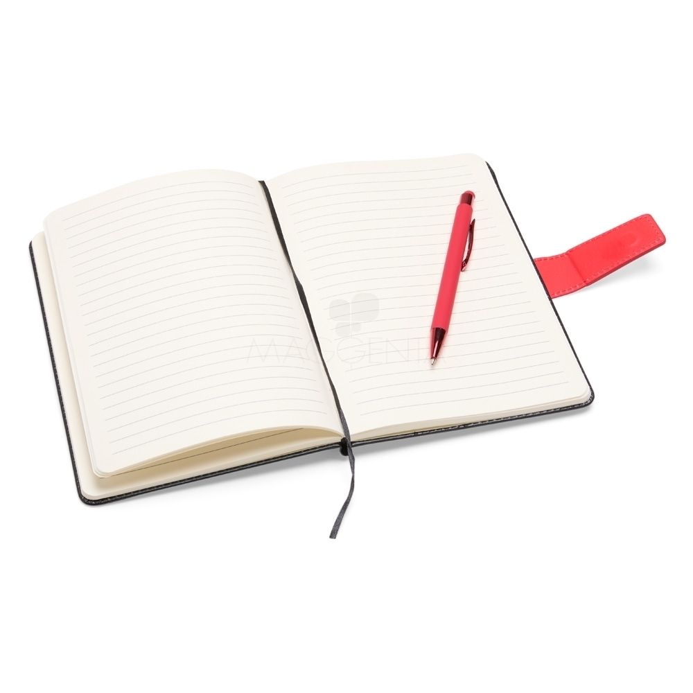 Kit executivo com duas peças, composto por uma caderneta de capa em couro sintético com fechamento magnético e cerca de 80 folhas pautadas, e uma caneta em metal com detalhes em plástico, ponteira emborrachada para uso em dispositivos touchscreen e carga esferográfica azul de 1,0 mm. Acompanha uma caixa de papelão com berço em espuma para a caneta.