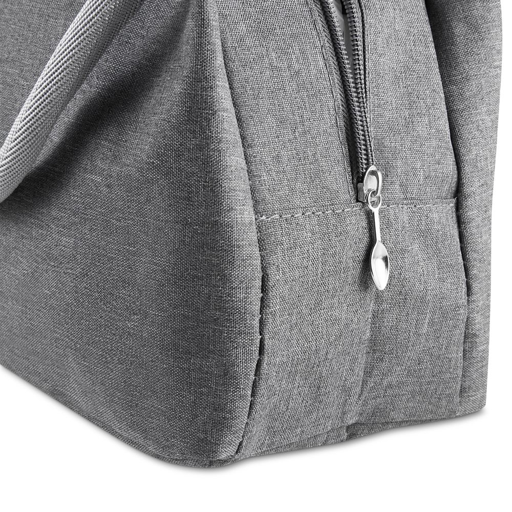 Bolsa térmica com alça de mão, confeccionada em poliéster 300D na parte externa e alumínio com manta térmica no interior. Modelo costurado, puxador de zíper em formato de colher, sem solda e capacidade para 5,6 litros.